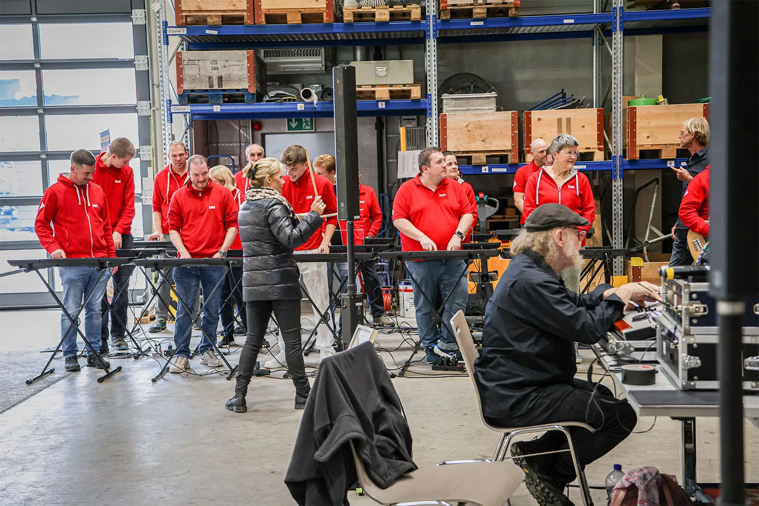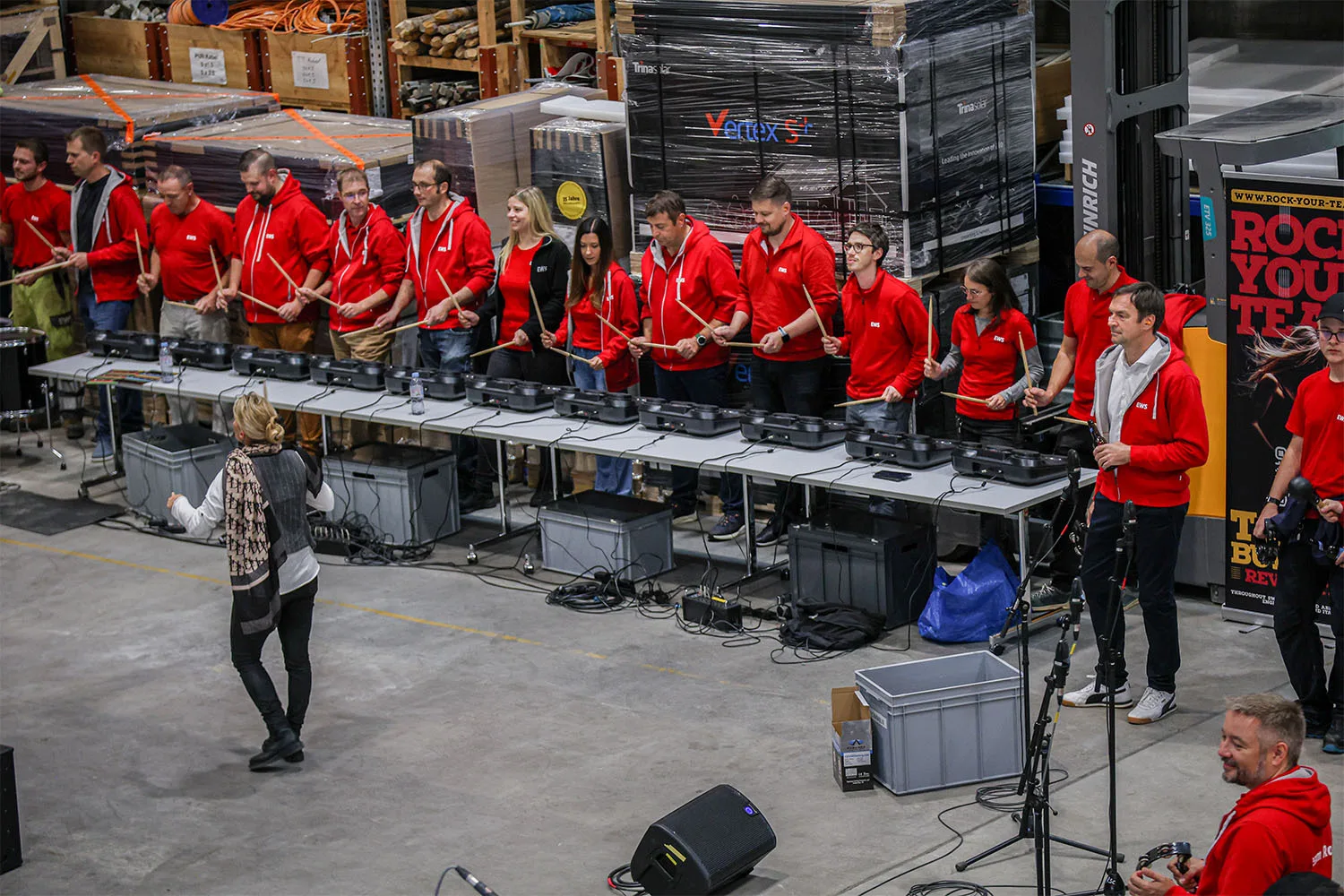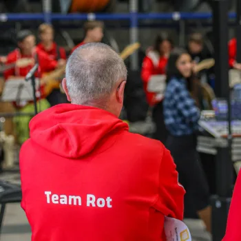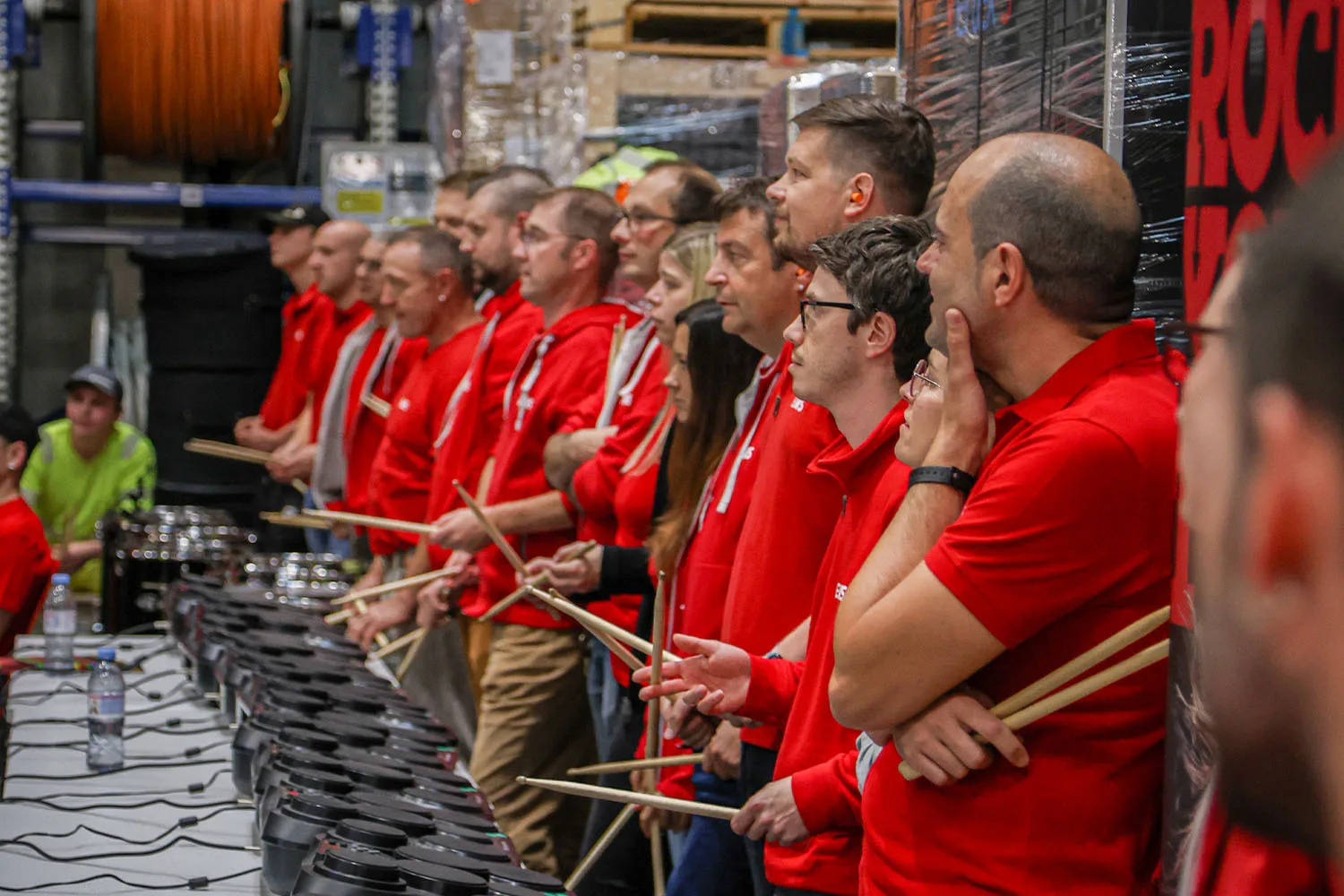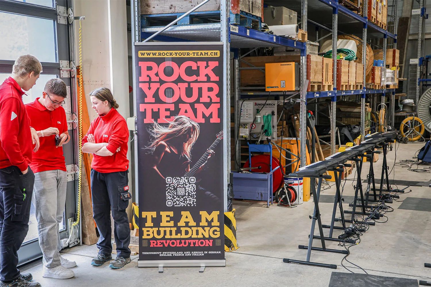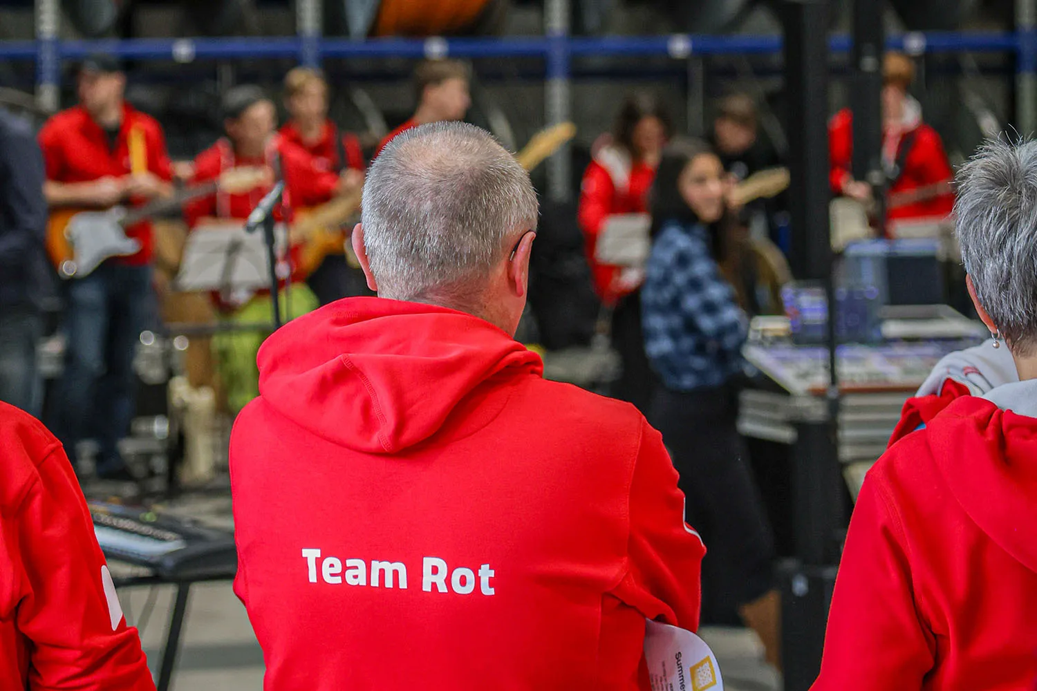 Schon beim Betreten des Raums war klar: Das wird kein gewöhnlicher Nachmittag. E‑Gitarren in Reih und Glied, Bass-Verstärker, Keyboard-Inseln, ein Schlagzeug-Setup, das jedem Open-Air würdig wäre. Und mittendrin rund 130 Team-Rot-Rockstars, die bereit waren, Neues auszuprobieren.