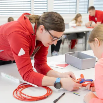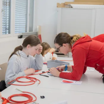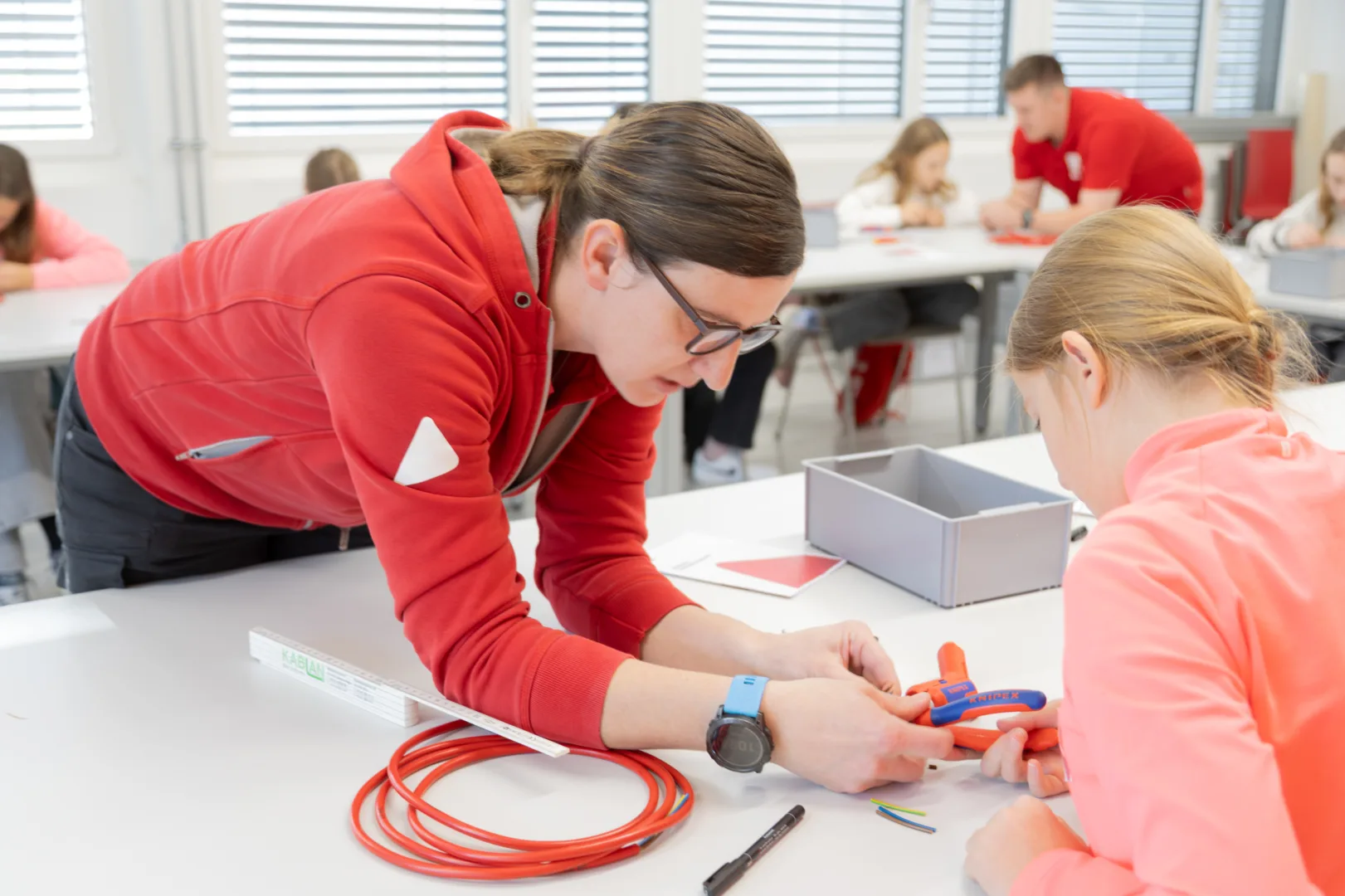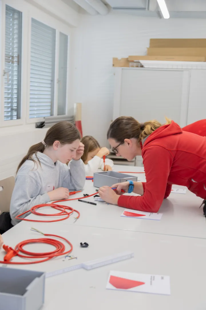 Der Zukunftstag beinhaltete neben einer kurzen Präsentation zur Einführung in die Welt der Energie auch praktische Workshops, bei denen die Mädchen selbst Hand anlegen konnten. Unter fachkundiger Anleitung fertigten sie ihr eigenes rotes Verlängerungskabel. Dabei waren die Expertise von Andrea Ulrich, Fachspezialistin Netzbau, und Lukas Gisler, Elektro-Projektleiter, sehr gefragt.